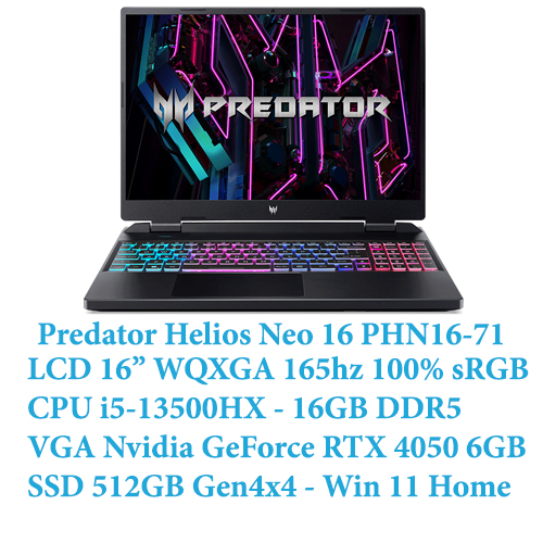 ACER PREDATOR HELIOS NEO PHN16-71-54CD(I5 13500HX/16GB RAM/512GB SSD/RTX4050 6G/16” 2K 165hz)